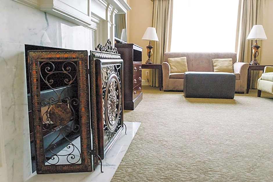 This suite features a fireplace with electric display, seating area with sofa bed and 2 40-inch TVs. A refrigerator is also included.